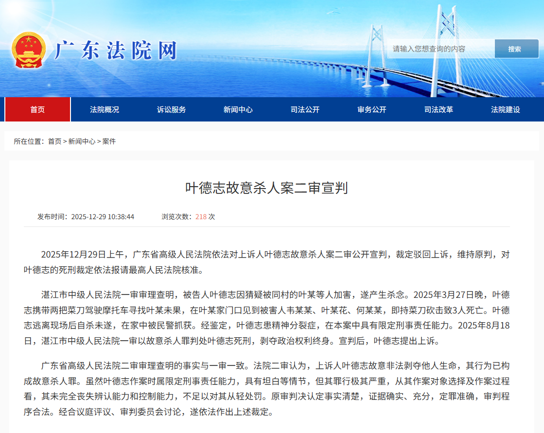 2025年12月29日上午财米网,广东省高级人民法院依法对上诉人叶德志故意杀人案二审公开宣判,裁定驳回上诉,维持原判,对叶德志的死刑裁定依法报请最高人民法院核准。